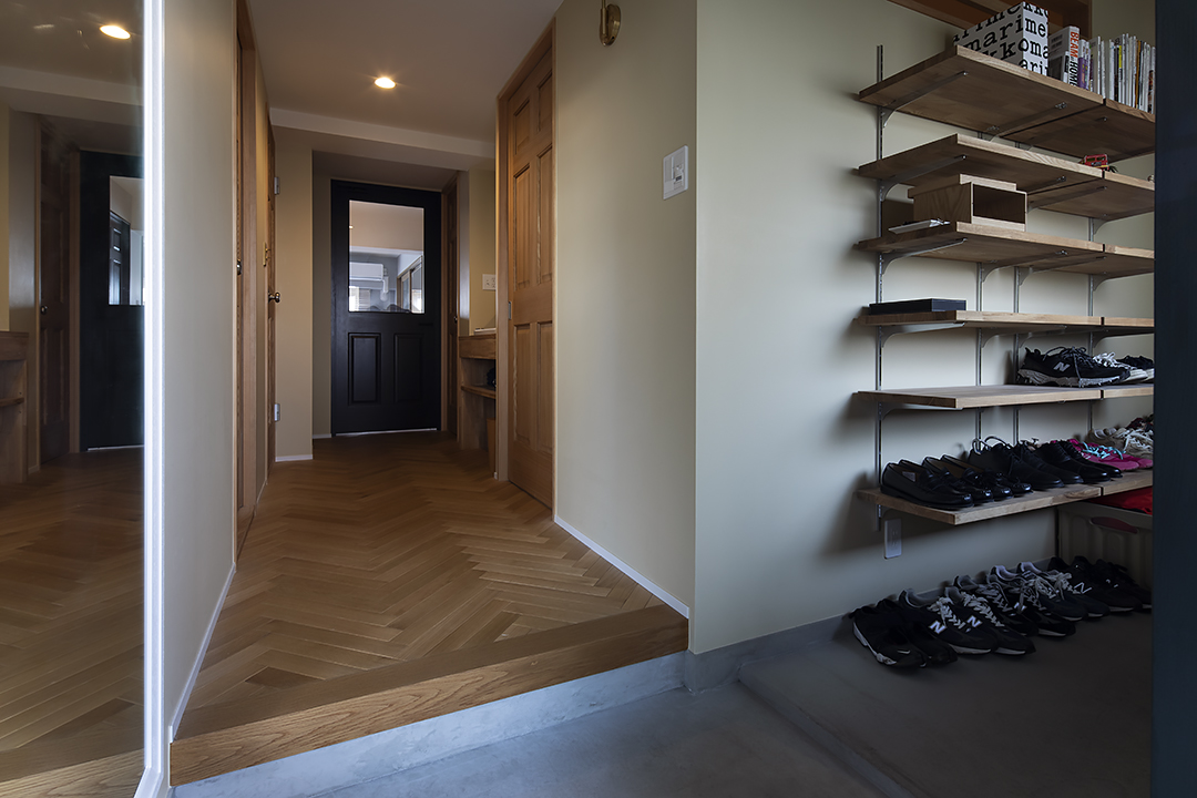 土間には、造作のシューズインクローゼット(SIC)を設置しました。広めにつくってあるので、たくさんの靴や書籍などがゆったりと飾られています。ここでも、窓からの光を隣の部屋(寝室)へ送る室内窓を取り付けたので、通気性もバッチリです。