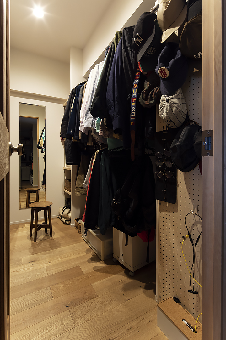 旦那様がいちばんお気に入りは、ウォークインクローゼット(WIC)と土間のシューズインクローゼット(SIC)。ウォークインクローゼットは、入って右側の一面が旦那様のお洋服、左側が奥様とお洋服となっています。有孔ボードを使って帽子を壁掛けするなど、スペースを活かした収納アイデアもポイントです。