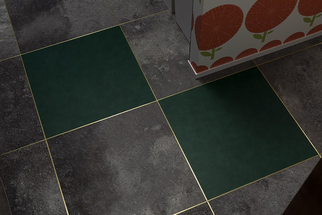 床はグレーのタイルに目地はゴールド。アクセントに少し色を取り入れようと、グリーンのタイルを2枚はめ込みました。この絶妙な位置関係も設計担当と話し合って決めたお気に入りポイントです。