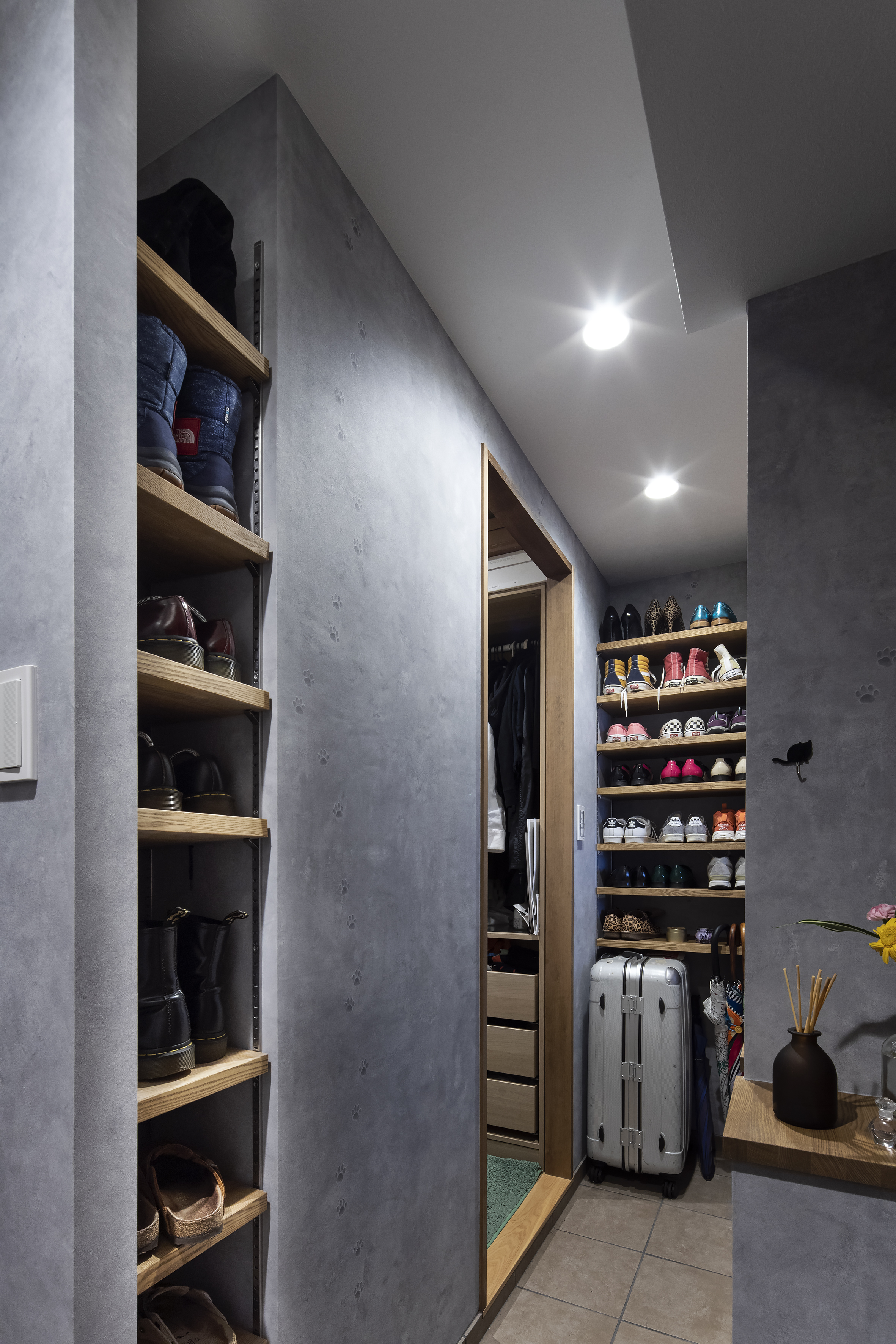玄関土間にはシューズインクローゼットを。美しい靴のコレクションを飾るように収納できる造作棚を設置しました。コロナ前には、年に2回は海外旅行に行かれていたというご夫婦の、お気に入りのお土産たち(奥様曰く「我が家の守り神!」)が可愛らしく出迎えてくれます。