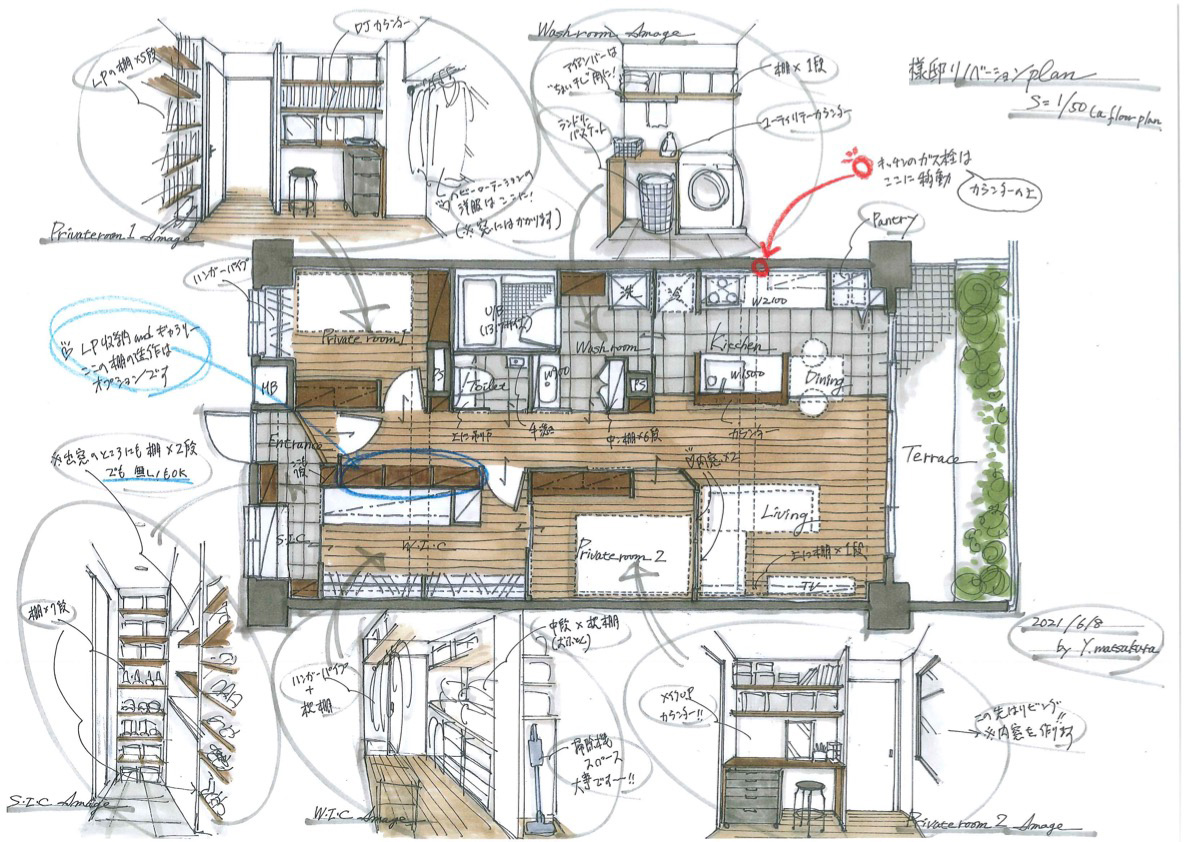 ラフプランとAfterの間取り図で、ご夫婦のお部屋が入れ替わっているのは、玄関側のお部屋には旦那様のターンテーブルを置くスペースを取れなかったため。結果的に夜遅くまで作業されることもある旦那様のお部屋をリビング側にしたことで、奥様も自室で夜をゆったり過ごせるようになったとお話ししてくださりました。