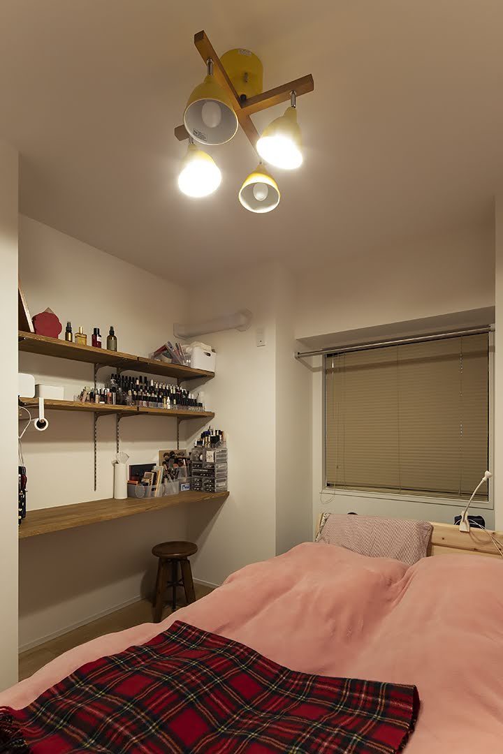 美容師をされている奥様のお部屋には、メイクアップ用の造作カウンターと、メイク道具を収納できる造作棚を作りました。壁紙はあえて白をセレクト。これからポスターや絵などで、思う存分飾り付けしていく予定なんだそう!