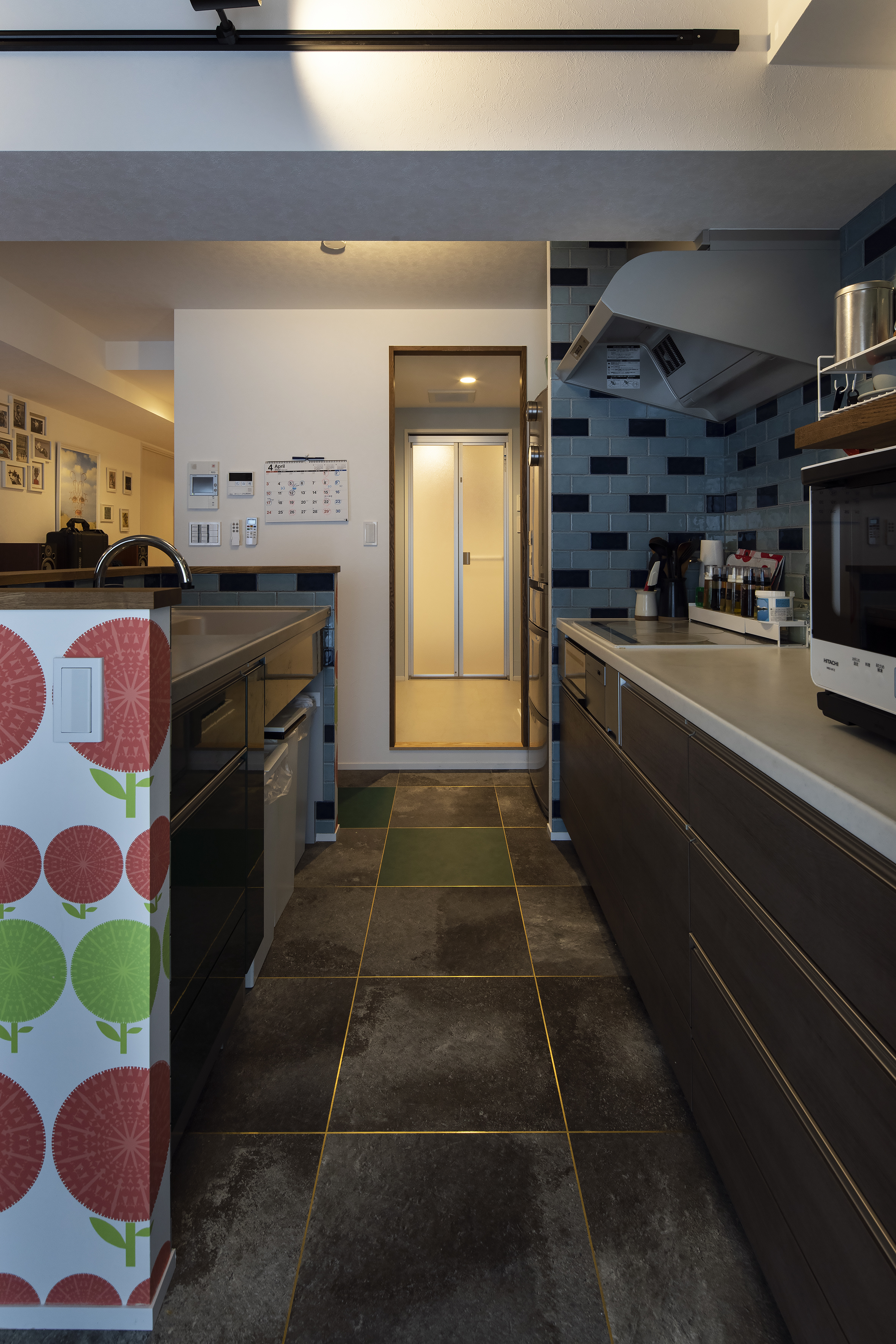 ブルーの壁に世界地図のパネルが貼られたリビング。「迷ったときは面白そうな色やデザインを選んだ」と語るご夫婦の色鮮やかな住まいです。あちこちに色が散りばめられた、センスが光るリビングダイニング。たくさんのレコードや靴などをコレクションとして魅せながら収納している、ギャラリーのような廊下やネコの足跡がデザインされた土間やシューズインクローゼットも圧巻です。暮らしやすさも妥協せず細やかな工夫がたくさん詰まっています。